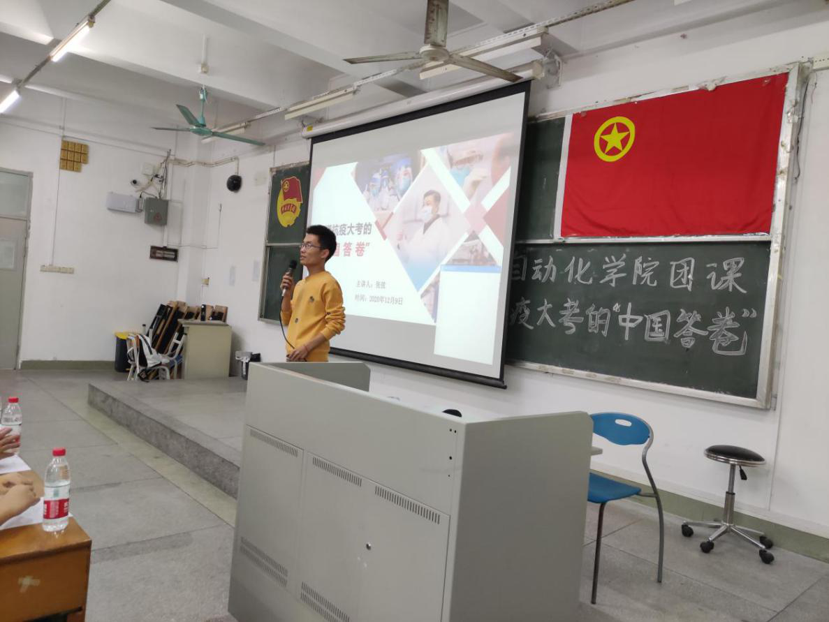 12月9日下午,自动化学院团委在教学楼B601开展以“读懂抗疫大考的中国答卷”为主题的团课。出席本次主题团课的嘉宾有自动化学院党总支副书记黄毅、自动化学院团委副书记张弦、辅导员袁萌、江晗菁、校团委学生代表、人文学院学生代表、自动化学院各学生组织代表、各班级团支书和自动化学院全体团员。本次团课由自动化学院团委副书记张弦老师主讲,自动化学院团委组织部谢瑾主持。