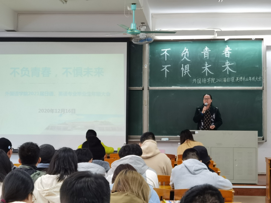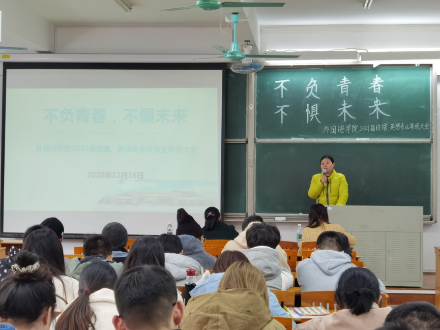 12月16日下午,外国语学院在杨钊杨勋楼307召开2021届日语、英语专业年级大会。学院党总支书记吴小玲、院长李磊、党总支副书记柴明勤出席会议,来自2021届日语、英语专业100余名毕业生参加会议。会议由年级辅导员陈韵主持。