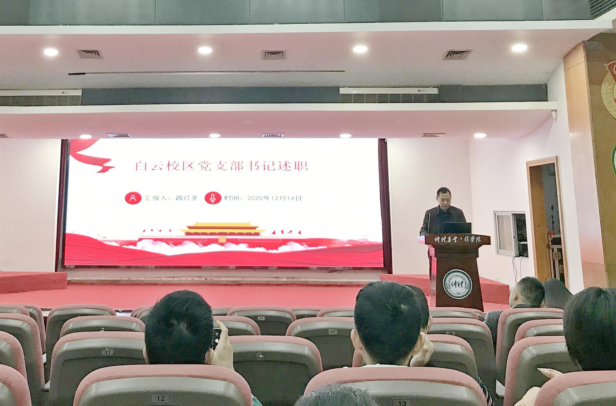 会上,昌灯圣首先介绍了白云校区党支部的基本情况,接着从“七个有力”方面对支部党建工作做了汇报。对学习宣传贯彻党的十九大、十九届二中、三中、四中、五中全会精神、“三会一课”制度进行总结,对主题党日活动开展、发挥党员先锋模范作用等方面的各项工作进行了汇报。