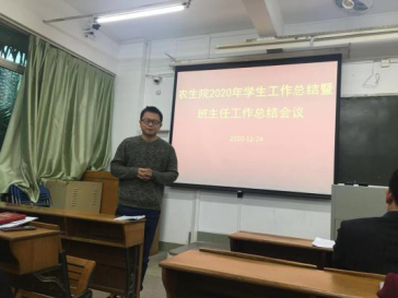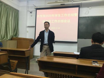 周超雄副书记首先对我院2020年学生工作的总体情况做了汇报。他介绍了这一年来在全体师生共同努力下,我院在学生工作中取得的丰硕成果,如学院团委荣获学校2019~2020年度“五四红旗团委”称号、学生会荣获学校2018-2019学年“优秀学生会”称号、我院取得校运会总分第三名的成绩等。接着他对学期末重点工作进行了布置,要求各班班主任结合实际情况开展主题班会,重点做好考风考纪教育、防诈骗教育以及宿舍安全教育等。最后,他对2021年重点工作进行了规划与部署,包括制定学生的成才档案、抓好学生社区教育工作、深化团学改革、更好发挥学生党支部的战斗堡垒作用等等。