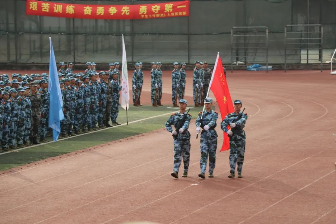 大会在国歌声中拉开序幕,全体成员起立对国旗行注目礼并奏唱国歌。三名护旗手伴随着军乐声从主席台前走过,管院学子有幸参与其中,护送军旗。