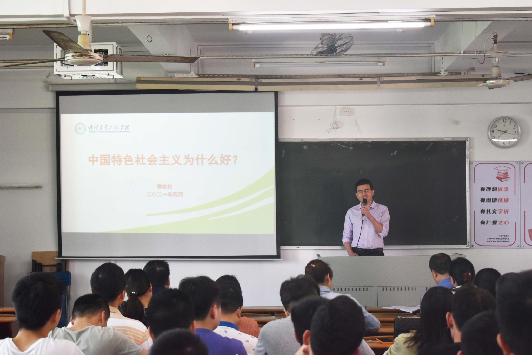 为隆重纪念中国共产党成立100周年,深入学习贯彻习近平总书记在党史学习教育动员大会上的重要讲话精神,做到学史明理、学史增信、学史崇德、学史力行,进一步增强党支部创造力、凝聚力和战斗力,充分发挥党建共建的互融互促作用,4月29日,马克思主义学院副院长秦抗抗老师受邀为自动化学院全体党员师生宣讲《中国特色社会主义为什么好》。