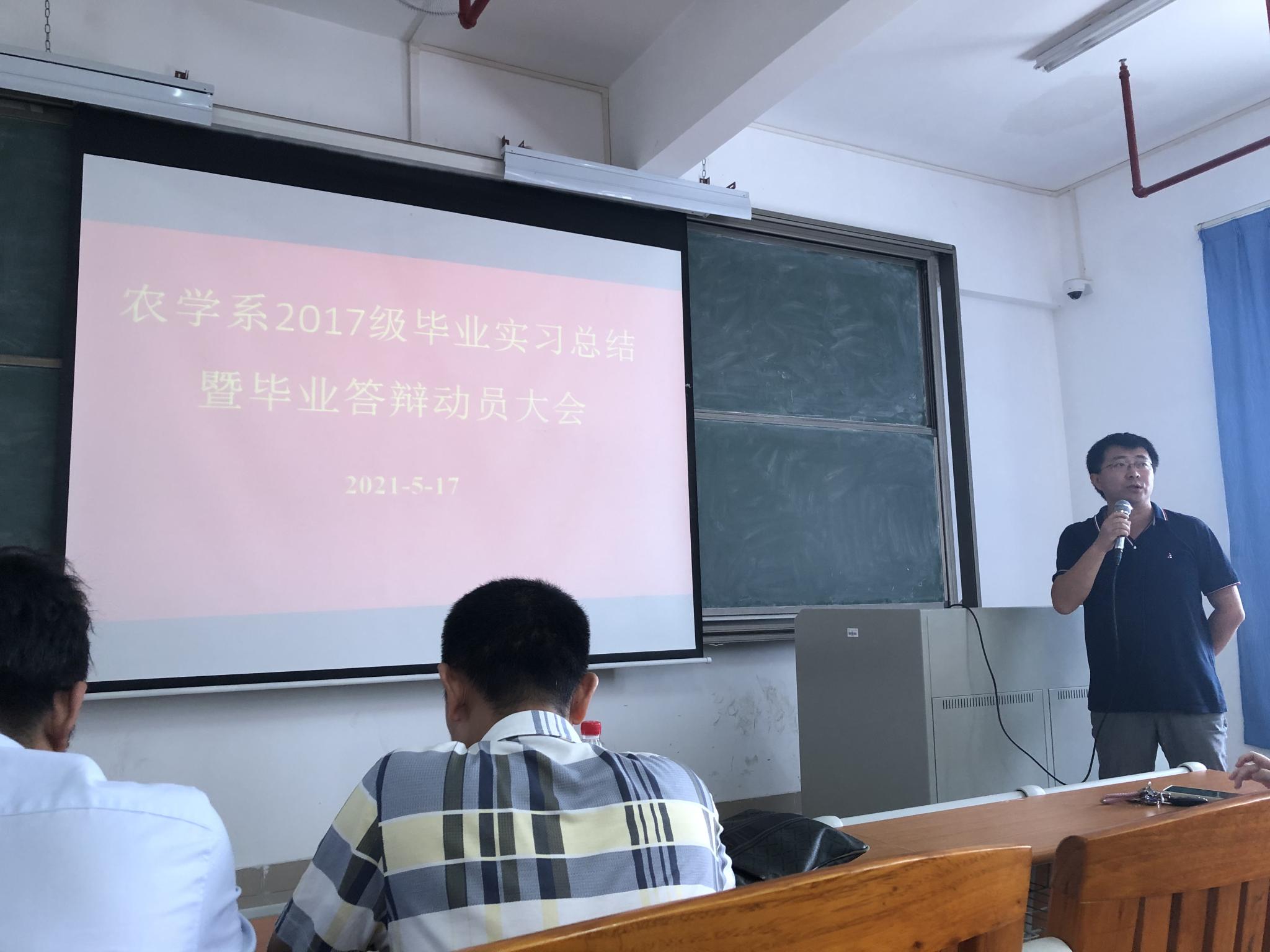2021年5月17日上午,农业与生物学院农学系在D栋504召开2017级毕业实习总结暨毕业答辩动员大会。会议由系主任陈青春副教授主持,农业与生物学院科研副院长万小荣教授、全体农学系老师和全体2017级学生参加了此次会议。