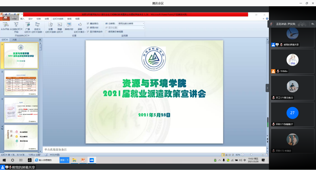 5月28日晚,资源与环境学院通过腾讯会议召开2021届毕业生文明离校教育暨就业派遣指导会。学院党总支副书记尹汉萍、辅导员熊雪老师,以及全体毕业生们共同参会。