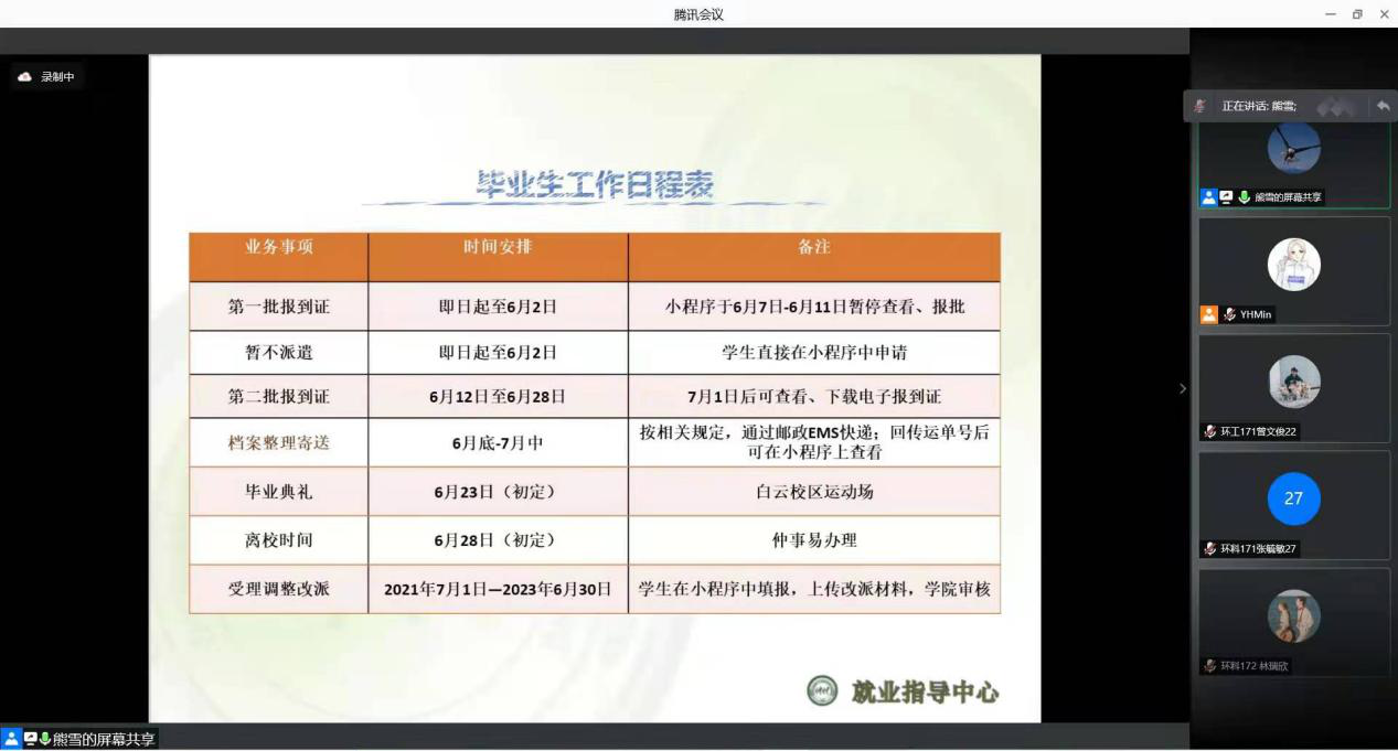 尹汉萍副书记对毕业生离校前可能遇到的问题作了指导,同时要求大家一是认真核算并及时补齐学分、确保顺利毕业;二是抓住招聘旺季的尾巴“先就业再择业”,及时填报就业信息;三是做好疫情防护,不信谣勿恐慌,遇到问题及时跟老师联系。