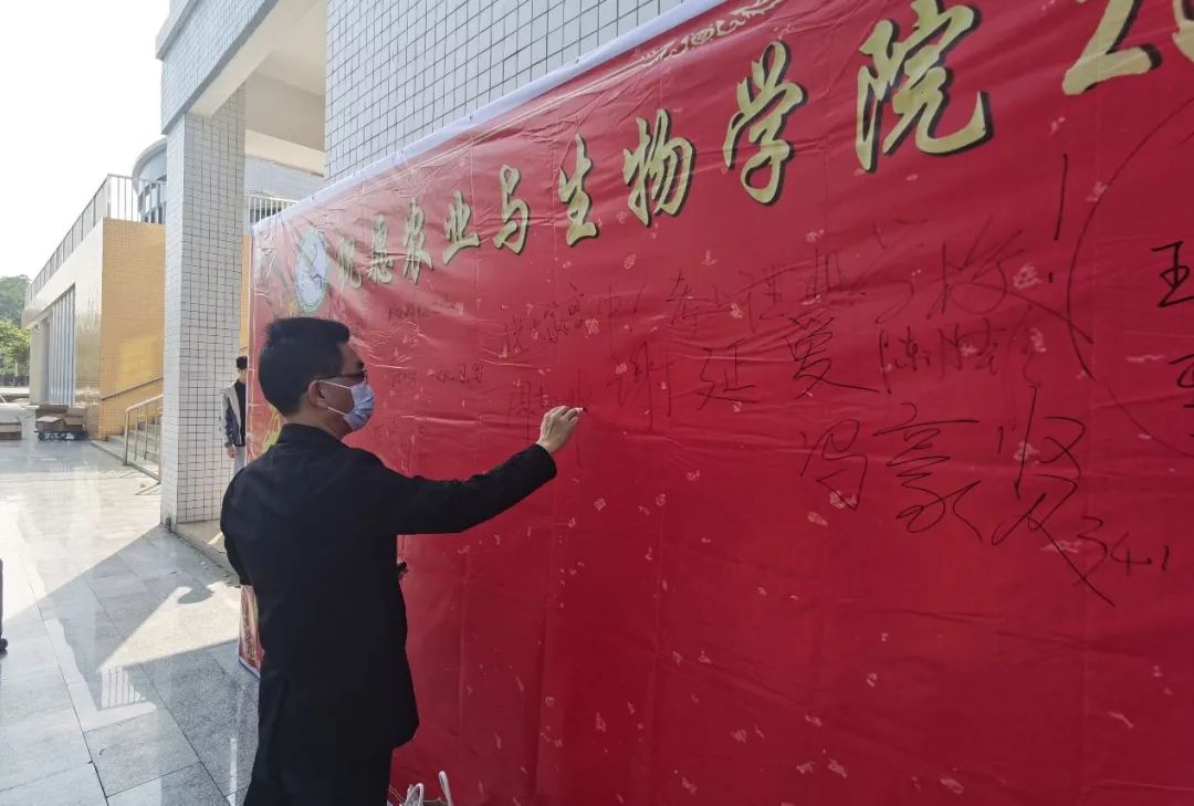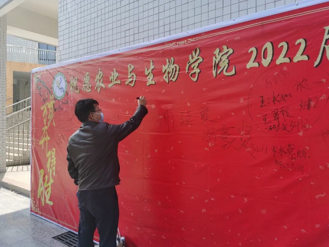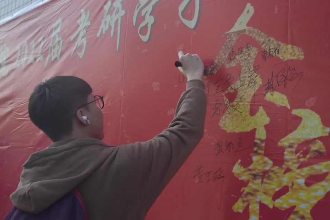 在出发前,陈丹雄带领考研同学们来到“金榜题名”签名榜上签名,给他们加油打气。同学们用坚定的笔触宣告着他们必胜的信心与决心,“研”途上,相约一“研”为定。