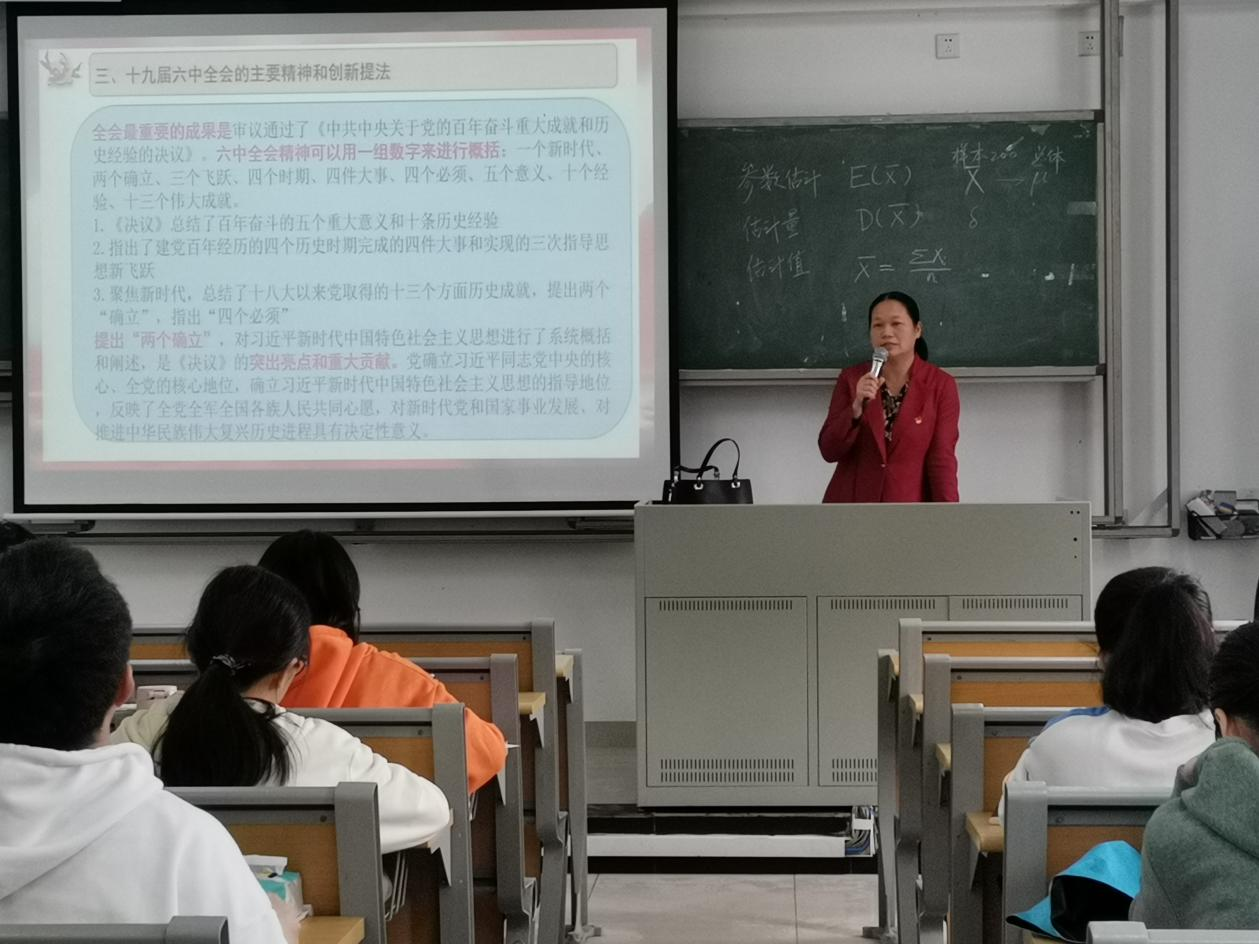 课上,吴小玲将十九届六中全会的精神作简要梳理与说明。课堂围绕党的十九届六中全会召开的背景和重大意义、党的三次历史决议的联系与区别、十九届六中全会的主要精神和创新提法、大学生要争做党和国家事业发展进步的骨干和栋梁四个方面,诠释了党百年奋斗的初心使命、重大成就和奋斗经验,阐明了全党更加坚定、更加自觉地践行初心使命,继续奋斗,走好新时代赶考路的决心。