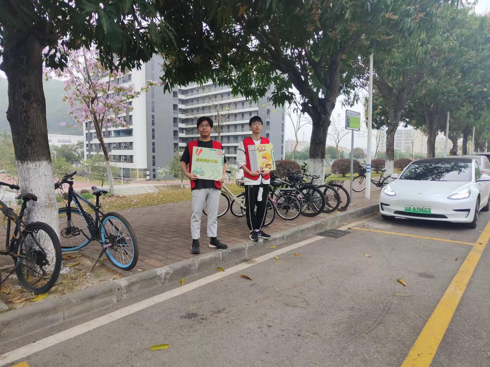 在学校保卫部指导下,支部书记吴晓瑜组织包装全体党员及团员将何楼至D栋教学楼这片区域内的违停车辆挪至停车区。活动周内,每天上下午上课前半小时均有安排志愿者在校道两侧、教学楼下空地,手举宣传板,积极引导学生规范停放电动车、自行车。通过整理和引导,干净整齐的一列列电单车,化身为校园内一道风景线。