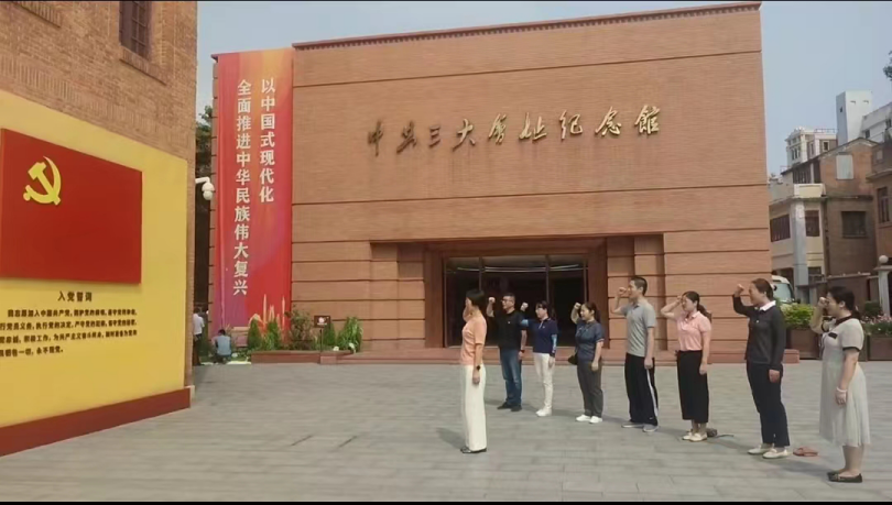 中共三大会址纪念馆位于越秀区恤孤院路3号,是广东省爱国主义教育基地、党员教育基地。在中共三大会址纪念馆遗址广场,由马克思主义学院党总支书记姜晓丽领誓,第三支部教师党员在纪念馆前面向党旗庄严宣誓,重温入党誓词,铿锵有力的宣誓声响彻广场。随后,教师党员们进入纪念馆陈列厅参观。