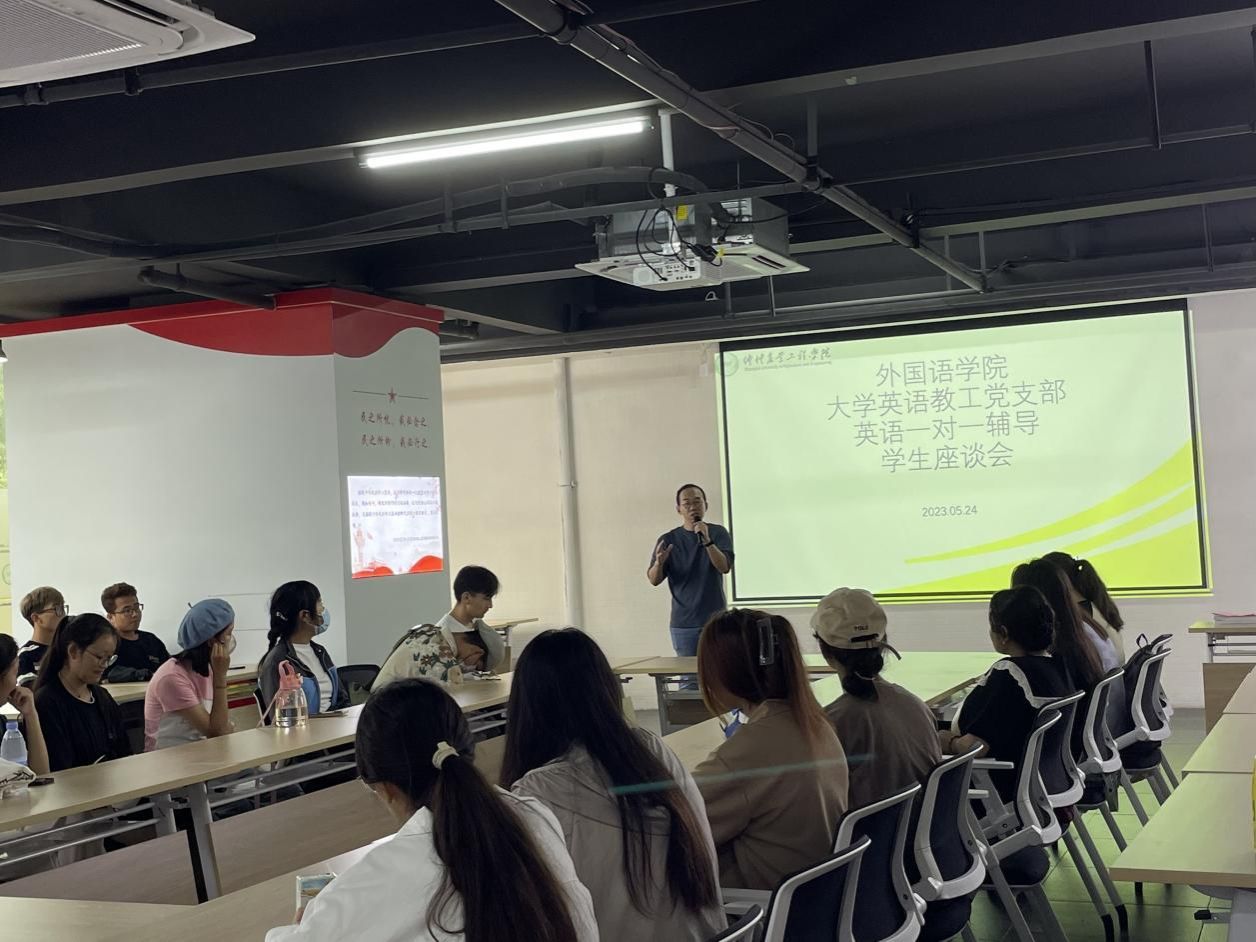 为深入开展学习贯彻习近平新时代中国特色社会主义思想主题教育,以调查研究推动主题教育走深走实,切实帮助我校部分少数民族学生解决英语学习困难,提高学业成绩,铸牢中华民族共同体意识,外国语学院大学英语教工党支部于5月24日在23栋党建室开展少数民族学生代表英语“一对一”辅导座谈会。学生工作部思教科阿卜杜外力▪麦麦提敏、外国语学院大学英语教工党支部书记郑楠、辅导员刘阳以及各学院少数民族学生代表参与座谈。