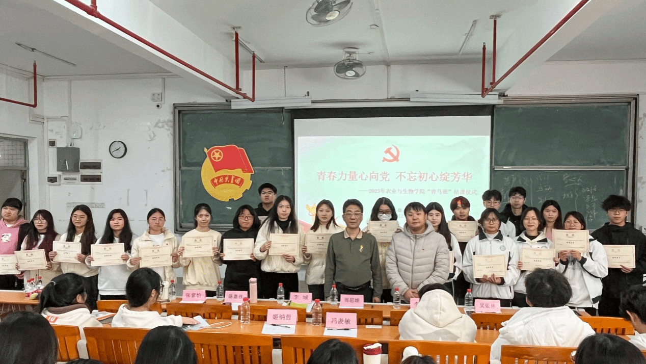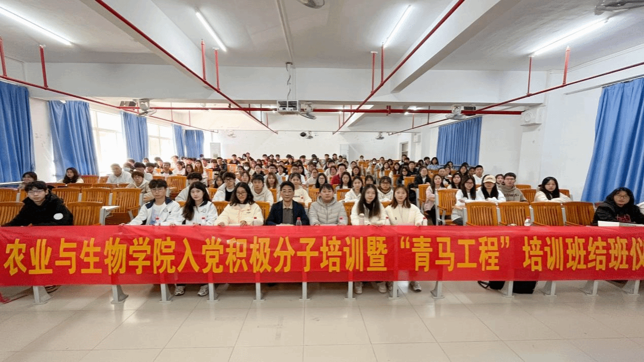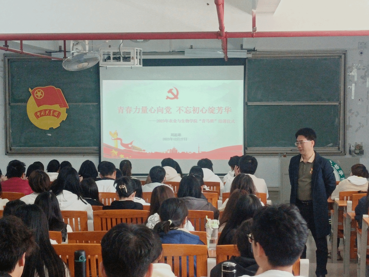 为深入学习宣传贯彻党的二十大精神,进一步端正入党动机,加深入党积极分子和“青马工程”培训班学员对党的理论知识的了解。12月27日中午,农业与生物学院在白云校区综合楼607室举行了2023年入党积极分子培训暨“青马工程”培训班结班仪式。农业与生物学院党委书记周超雄、团委副书记李城、学院全体入党积极分子以及“青马工程”培训班全体学员参加了本次结班仪式。