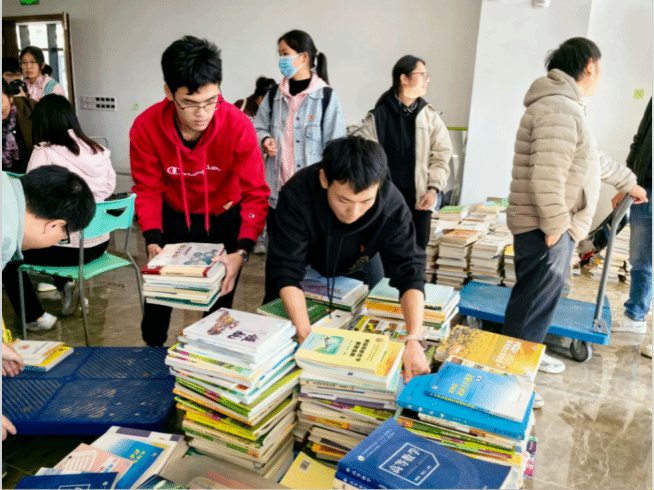 在活动前期,各学生党支部书记带领学生党员走进学院大三大四的学生宿舍,开展了一场书籍回收活动。这项活动旨在鼓励同学们积极参与,捐出自己不再需要的图书。学生党员们充满热情地逐户上门,向同学们解释了书籍回收活动的意义,并鼓励他们将闲置的图书捐赠出来。整个过程洋溢着激动和团结的氛围,学生党员带头捐书,同学们也纷纷响应号召,乐意将自己的图书捐出。